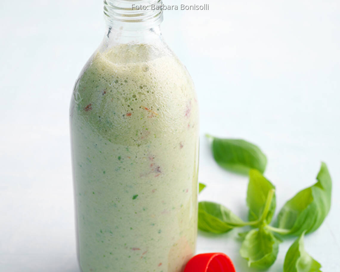 Gurke, Tomaten, Basilikumblätter und Kefir im Mixer fein pürieren, mit grünem Tabasco und Salz würzen. Auf Gläser verteilen und servieren.