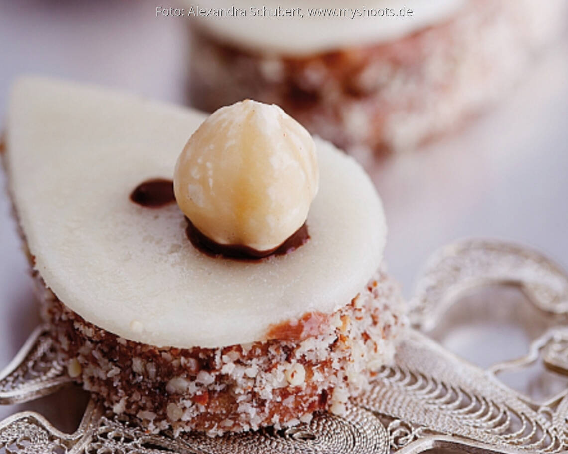 Marzipan ca. 2 mm dünn ausrollen und mit derselben Tropfenform ausstechen. Die Plätzchen mit den Marzipantropfen belegen. Haselnüsse leicht in die geschmolzene Kuvertüre tauchen und die Plätzchen damit garnieren.