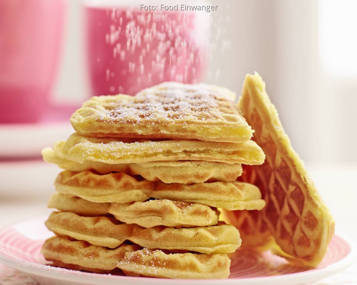 Die noch warmen Waffeln mit Puderzucker bestäuben und sofort servieren.