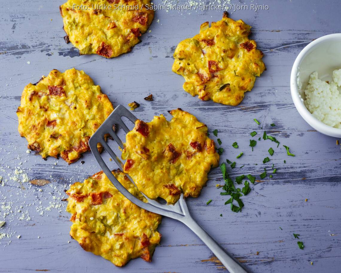 Die Puffer im Backofen (Mitte) in 20 Min. goldbraun backen. Die fertigen Puffer aus dem Ofen nehmen und warm oder kalt mit Kräuterquark oder dem Tomaten-Basilikum-Dip servieren.