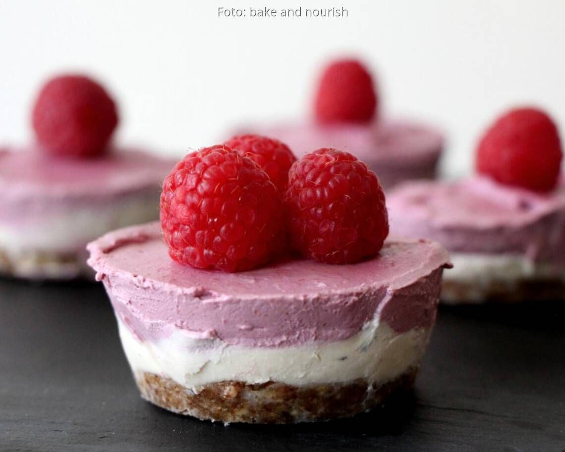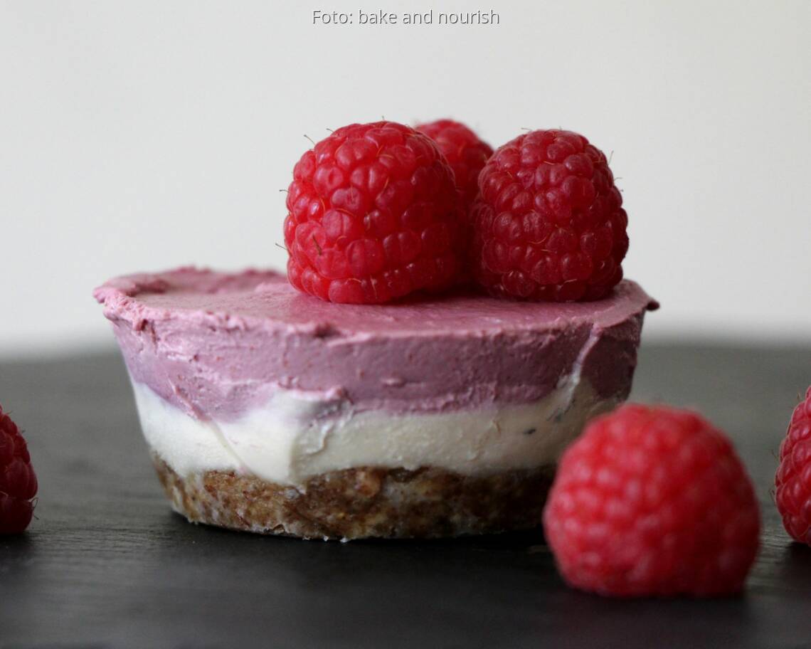 Füge die Himbeeren zur restlichen Füllung hinzu und mixe erneut, bis eine cremige Masse entsteht. Streiche sie auf die Füllung und lass die Törtchen im Gefrierfach mindestens 3 Stunden gefrieren.