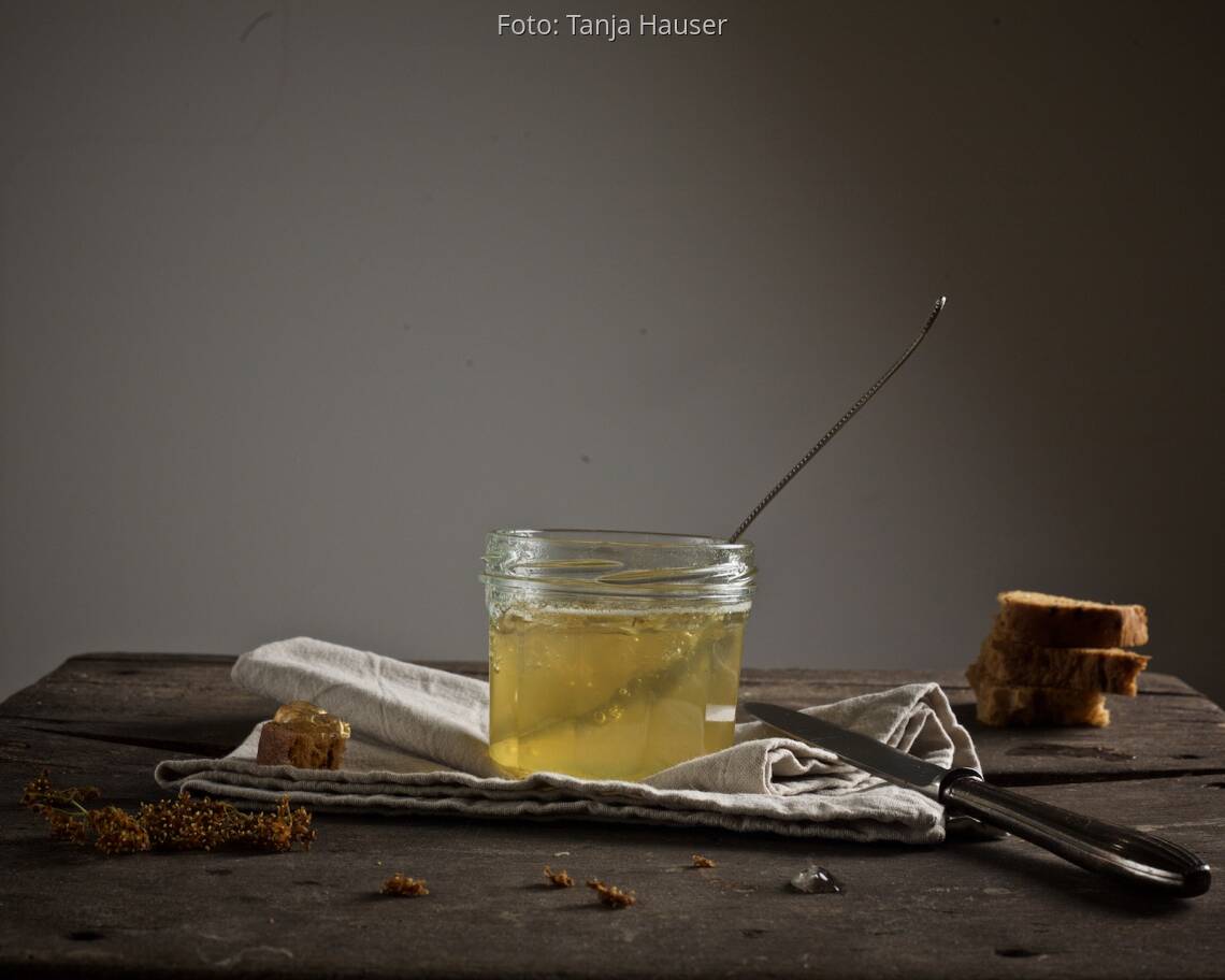 mit Holunderblütendolden, Wasser, Zitronensaft, Gelierzucker