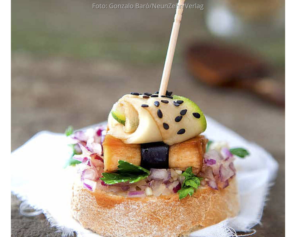 veganes Rezept von Gonzalo Baró„Pincho matrimonio“ ist traditionellerweise die Kombination einer Anchovis mit einer in Essig eingelegten Sardelle auf einem Stück Brot. In diesem Rezept verleiht das Zusammenspiel von Algen, Sojasauce und Sesamsamen dem Pincho eine asiatische Anmutung.