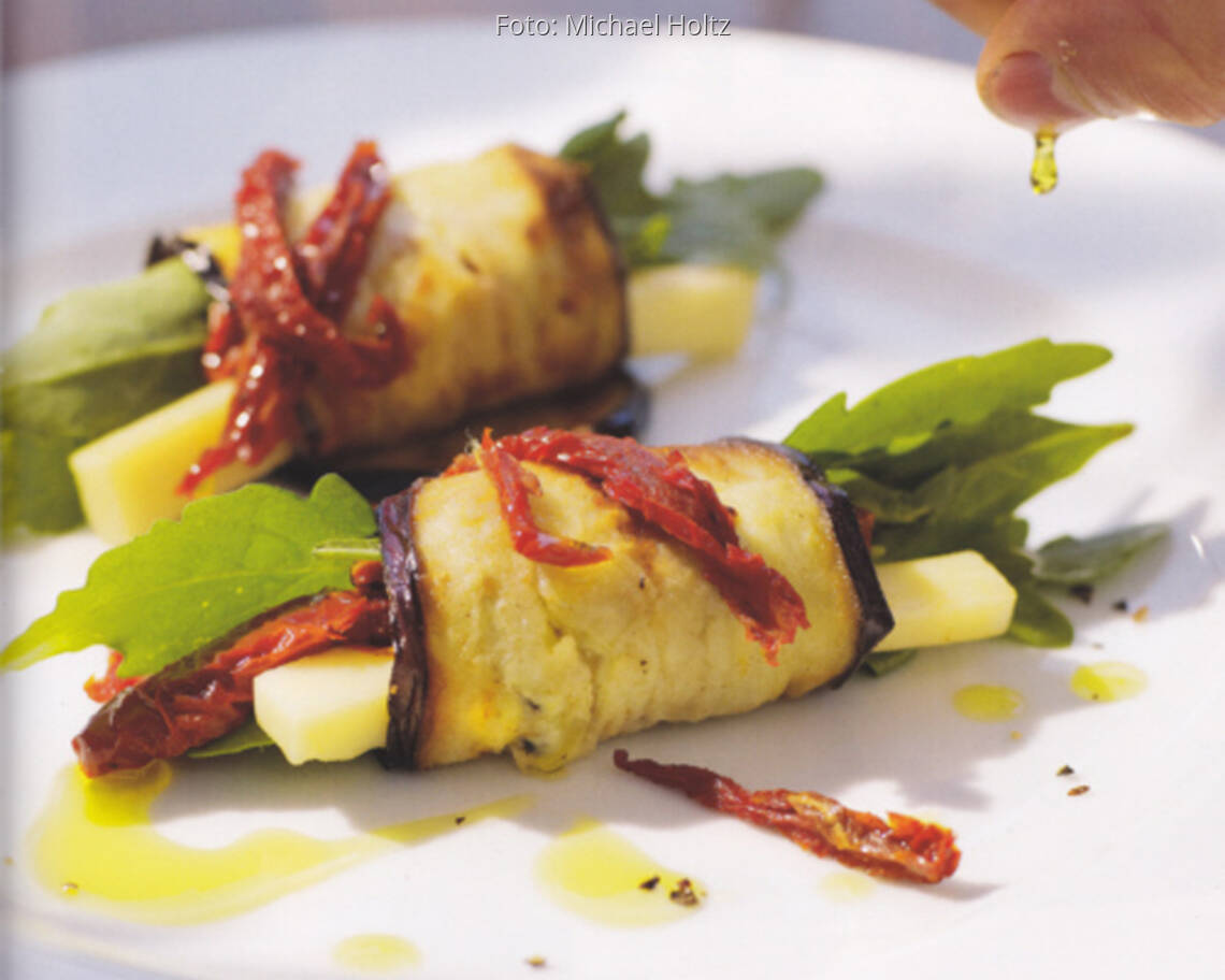 Foto: Michael HoltzInvoltini di Melanzane mit Rucola, Provolone und getrockneten Tomaten