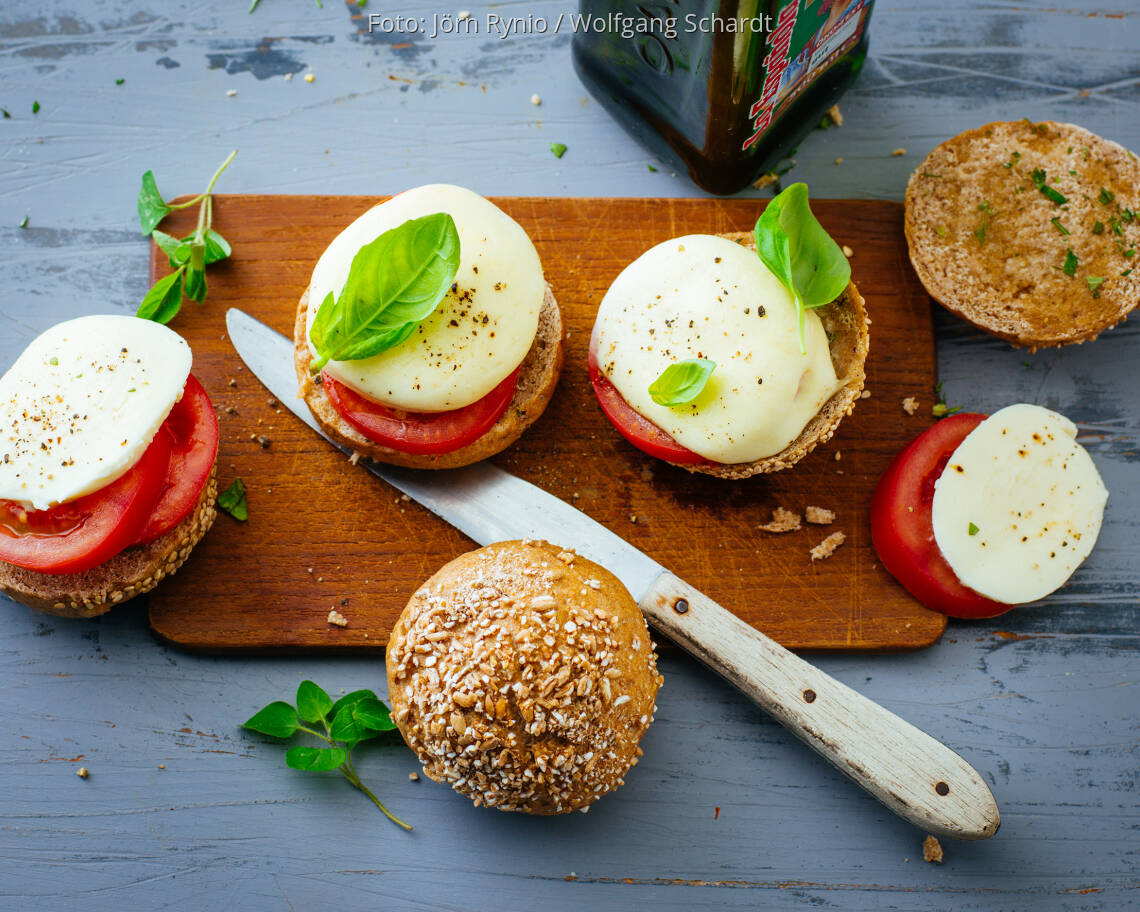 mit Vollkornbrötchen, Eiertomaten, Oregano, Mozzarella