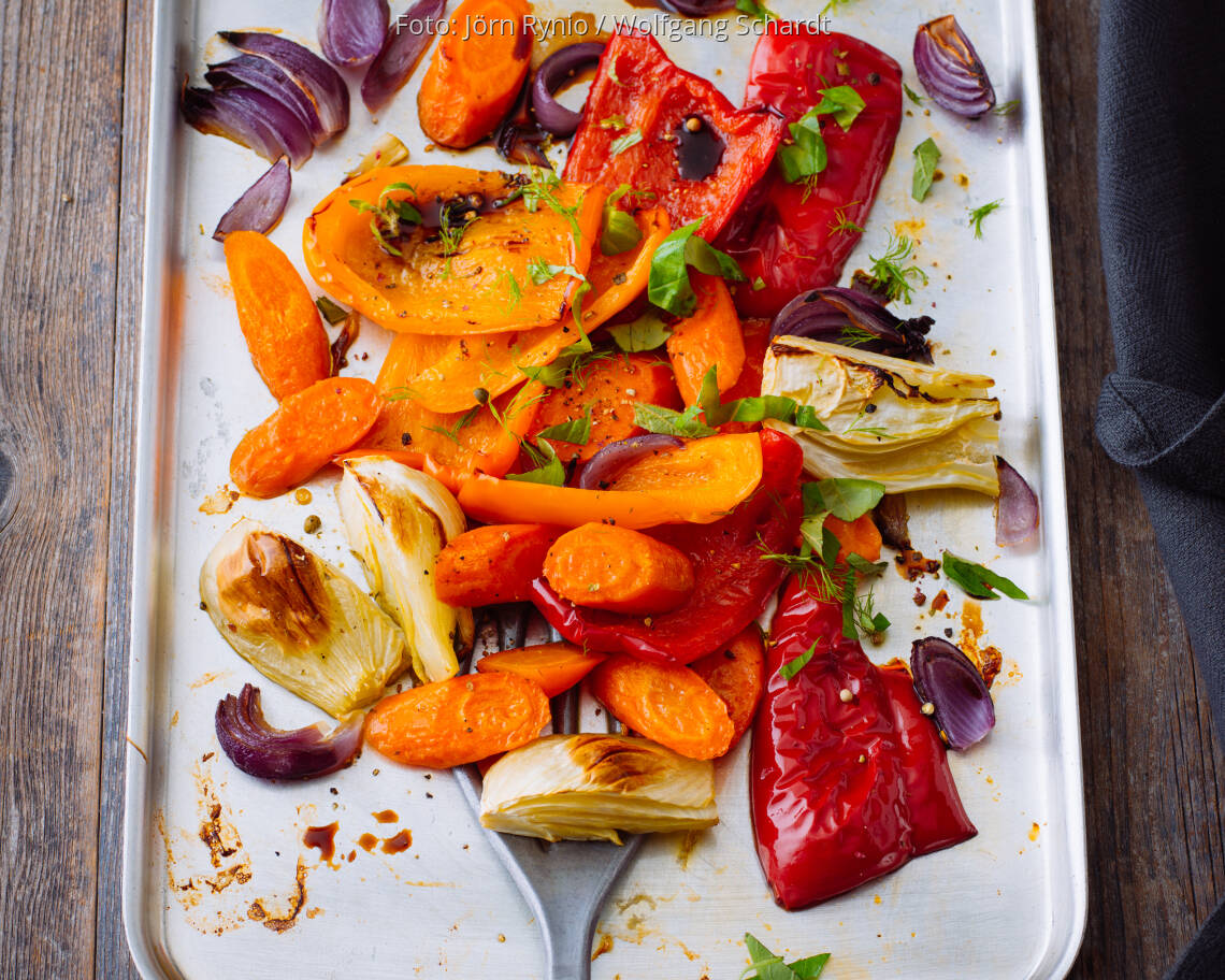 Das Gemüse 5 Min. vor dem Ende der Garzeit mit Aceto balsamico beträufeln. Das fertige Ofengemüse aus dem Ofen nehmen, kurz abkühlen lassen, mit den Kräutern bestreuen und am besten lauwarm servieren.