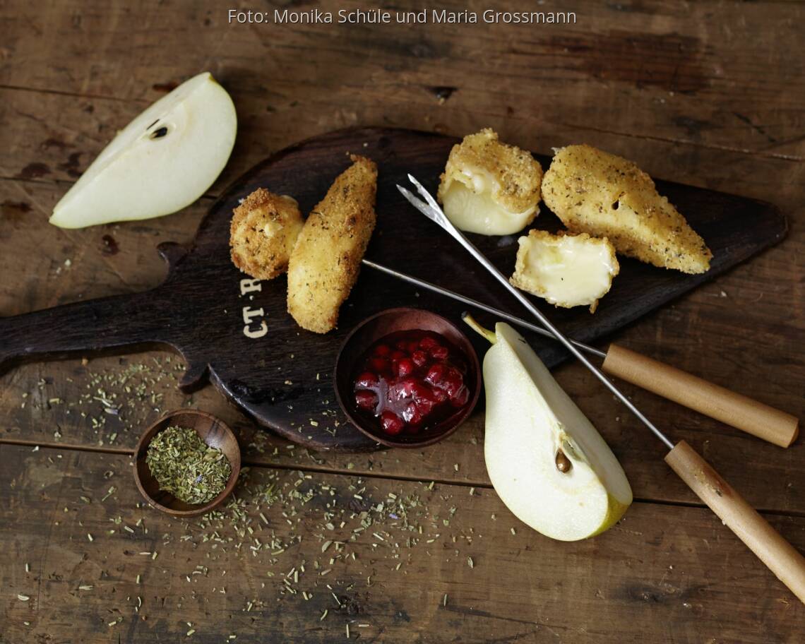 Je ein Stück Käse oder Birne auf eine Fonduegabel spießen, zuerst im Mehl wenden, dann durch die verquirlten Eier ziehen und zuletzt in den Semmelbröseln wenden, diese mit den Fingern gut festdrücken. Den Brie nochmals durch Eier und Brösel ziehen. Im heißen Fett goldgelb ausbacken und mit Preiselbeeren genießen.