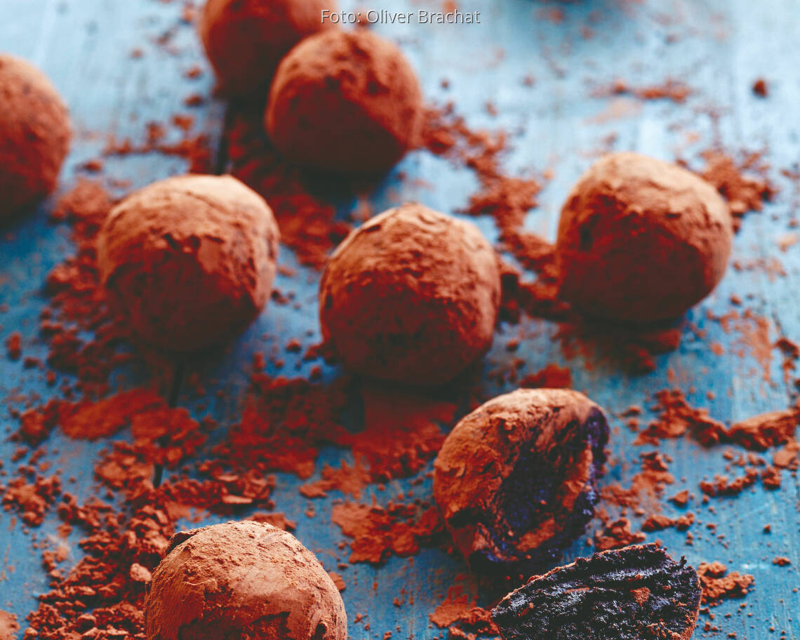 Die Kakaobutter bei kleinster Hitze schmelzen und das restliche Kakaopulver klümpchenfrei einrühren. Die einzelnen Trüffel in der Kakaobuttercreme wälzen und leicht abgetropft wieder auf das Backpapier legen. Erneut 30 Minuten kalt stellen.
