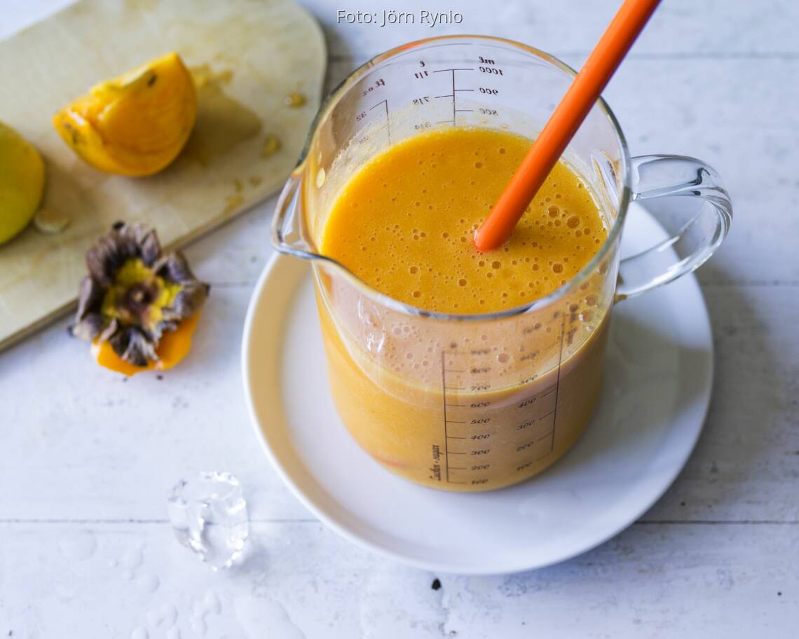 Kaki waschen und vierteln, dabei den Stielansatz herausschneiden. Das Fruchtfleisch mit einem Löffel aus der Schale schaben. Banane schälen und in Stücke schneiden. Orange auspressen.
