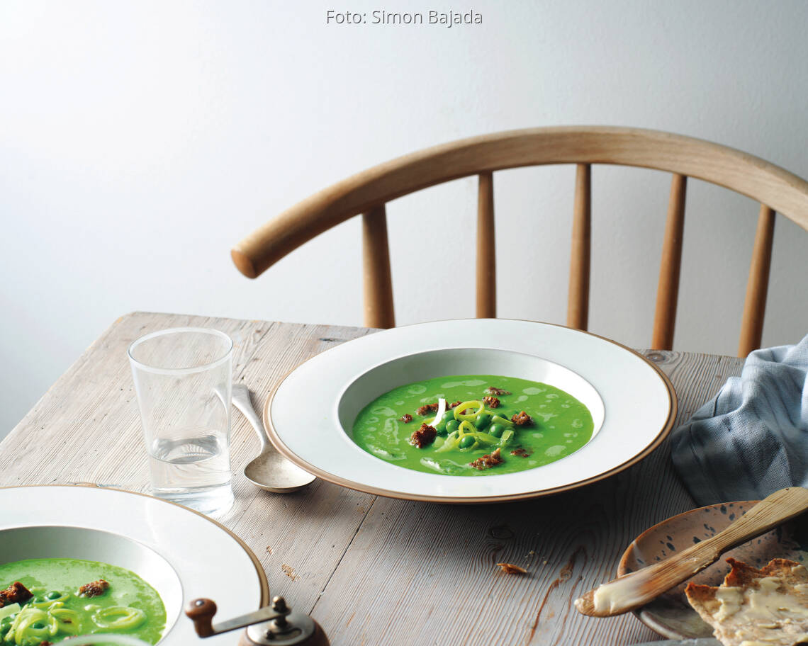 vegetarisches Rezept von Simon BajadaDiese Suppe ist einfach nachzukochen, vor allem, wenn man dafür gefrorene Erbsen verwendet. Falls es Ihnen seltsam vorkommt, den Lauch zu zuckern: Hierdurch wird er leicht gebeizt, denn der Zucker entzieht ihm Wasser und gleichzeitig Bitterstoffe.