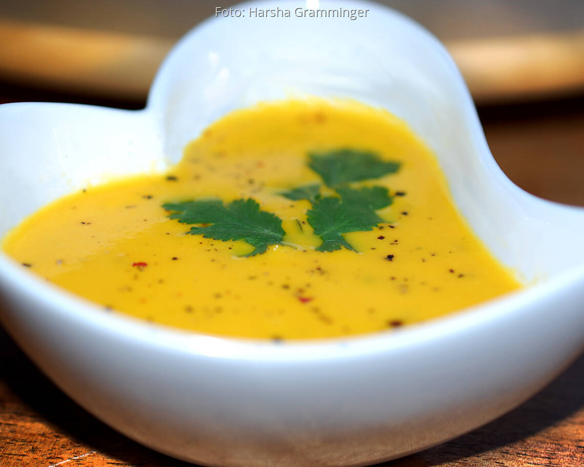 vegetarisches Rezept von Harsha GrammingerKarottencremesuppe wirkt Vata beruhigend ↓ – Pitta neutral – Kapha neutral