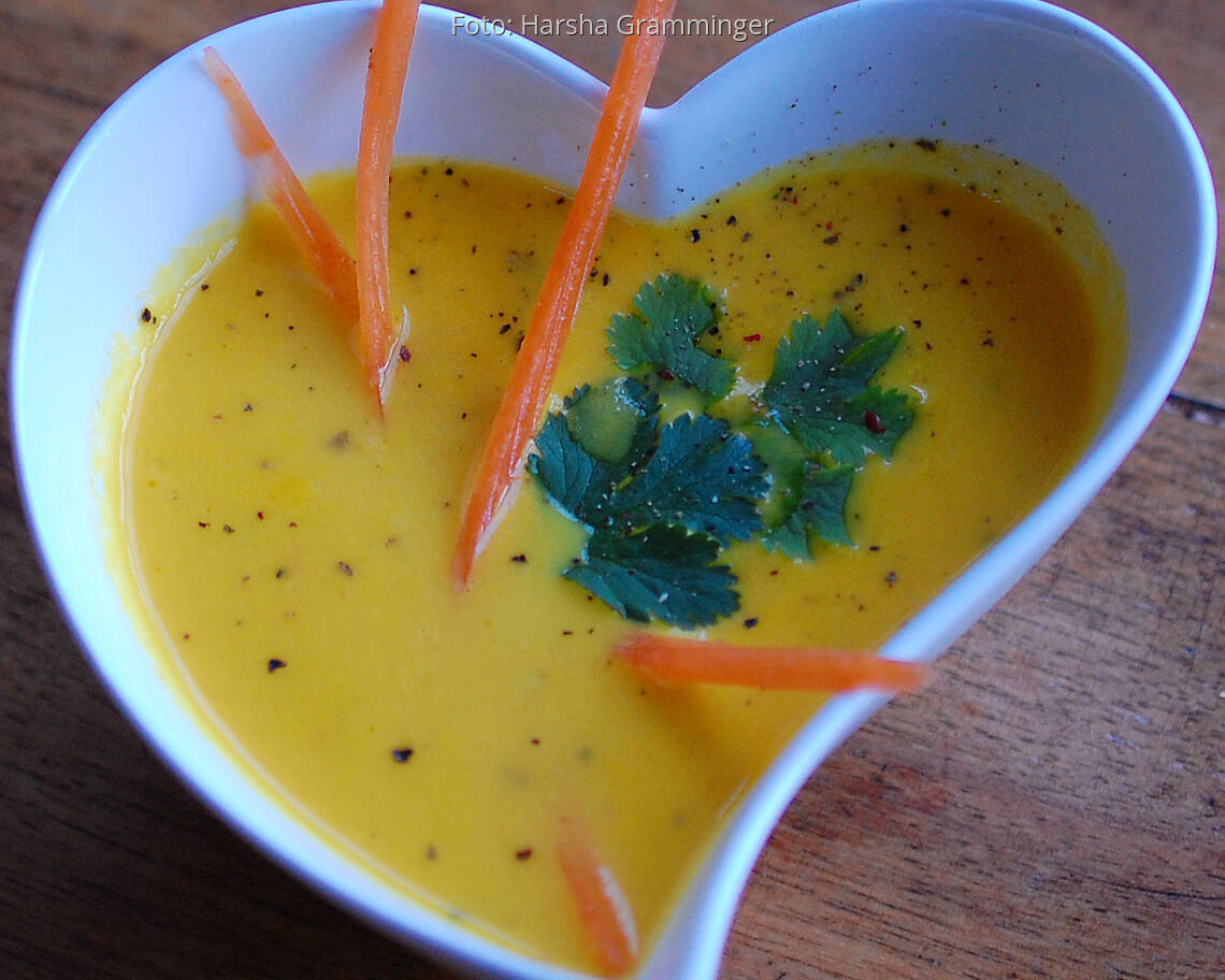 veganes Rezept von Harsha Grammingervegane Karottencremesuppe wirkt Vata beruhigend ↓ – Pitta neutral – Kapha neutral