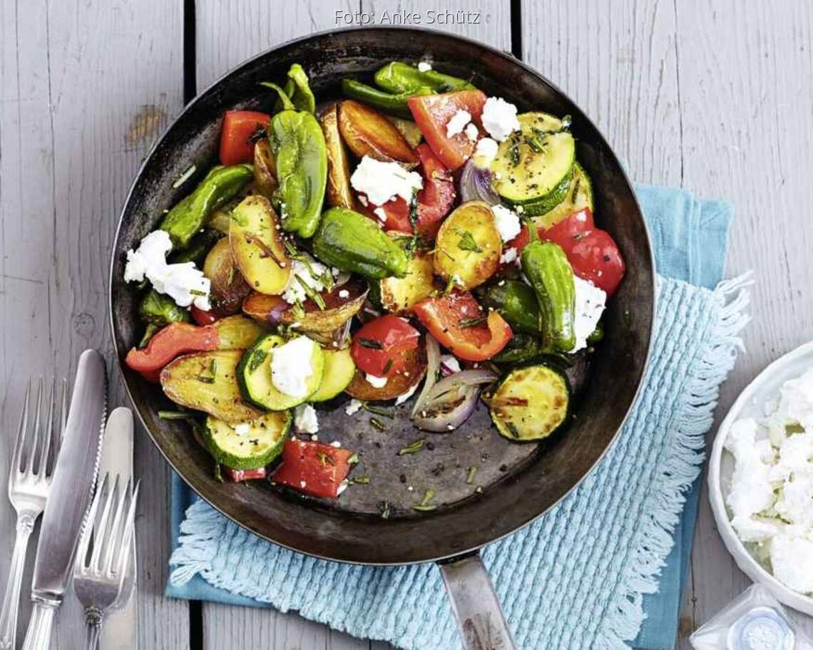 vegetarisches Rezept von Martina KittlerSie suchen ein Rezept für südliche Lebensfreude? Da ist der Mix aus Kartoffeln, Paprika und Zucchini genau richtig! Rosmarin, Knoblauch, Feta und Oliven liefern mediterrane Würze.