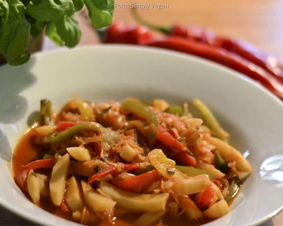 Das Öl erhitzen und die Zwiebeln darin glasig dünsten. Kartoffeln, Paprika, Sauerkraut, Tomatenmark und Salbei dazugeben und ein paar Minuten mit andünsten.