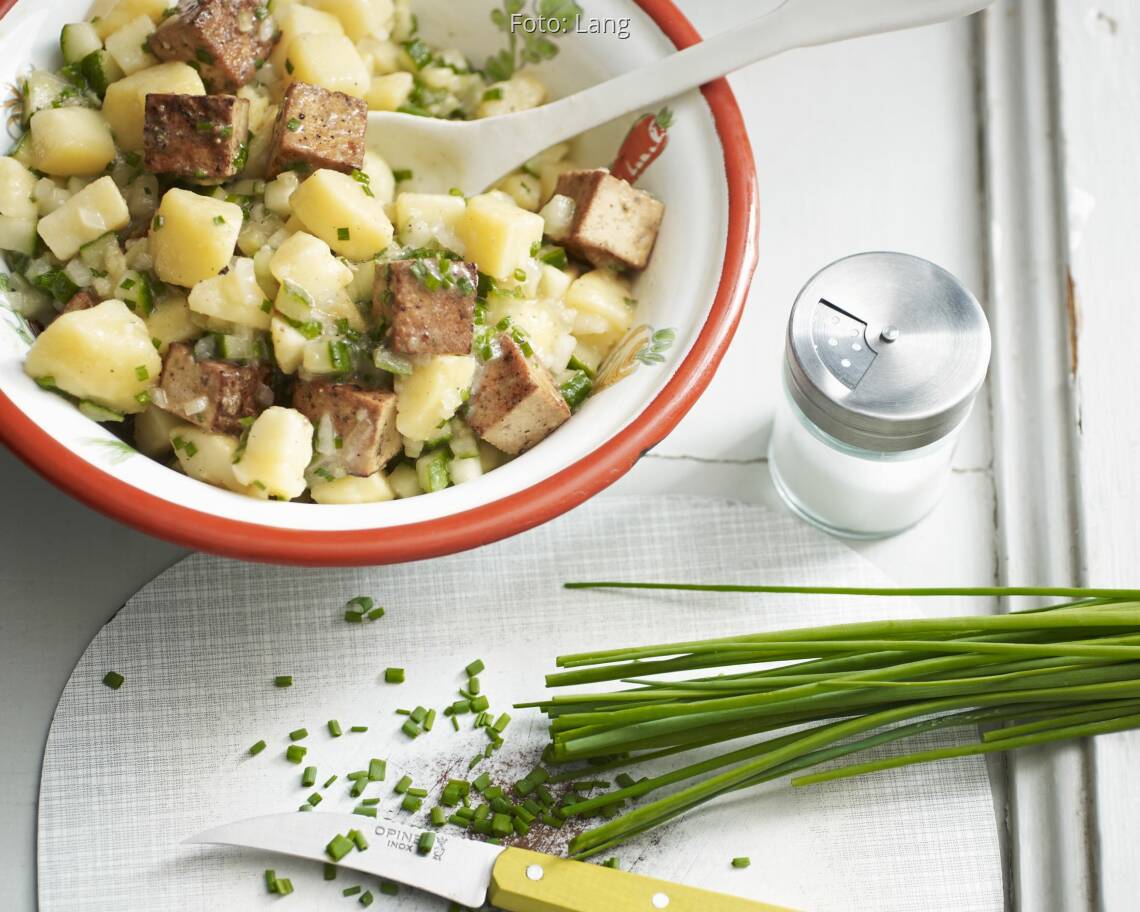 Salat mit Salz und Pfeffer abschmecken, abkühlen lassen und zugedeckt mindestens 1 Std. im Kühlschrank ziehen lassen. Den Kartoffelsalat nach Belieben vor dem Servieren nochmals abschmecken.