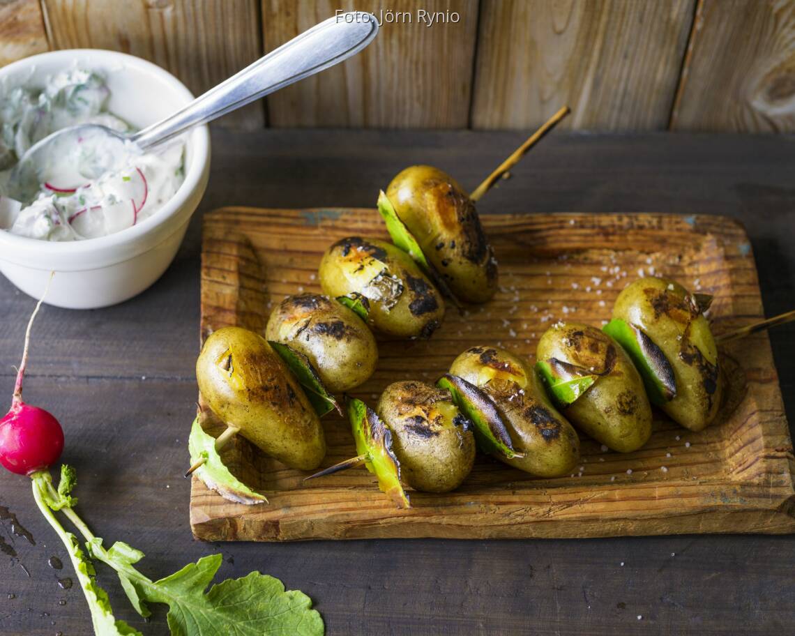 Die Kartoffeln abwechselnd mit Lorbeerblättern auf Spieße stecken und mit Öl bepinseln. Den Grill vorheizen. Den Rost mit Öl einreiben. Die Kartoffelspieße bei mittlerer Hitze 10 Min. grillen, dann mit dem Quark genießen.