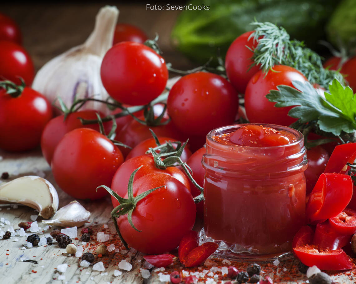 Strunk der Tomaten entfernen. Tomaten mit Zwiebeln und Knoblauch sehr weich kochen. Danach so fein wie möglich mit einem Stabmixer oder in der Küchenmaschine pürieren. Zucker, Essig und Gewürze dazugeben und kurz einkochen lassen. Ketchup durch ein feines Sieb streichen und noch heiß in Schraubgläser füllen. Diese auf einem feuchten Tuch mit dem Deckel nach unten auskühlen lassen.