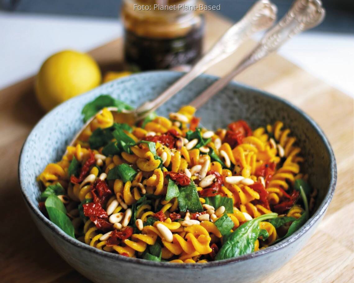 Foto: Planet Plant-BasedKichererbsen-Kurkuma-Fusilli mit Tahin und sonnengetrockneten Tomaten