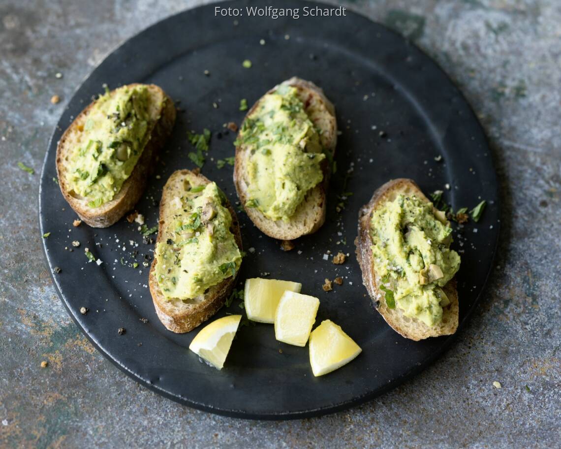 Minze waschen und trocken schütteln. Die Blätter abzupfen und fein schneiden. Die Oliven in Scheiben schneiden, beides zur Kichererbsencreme geben. Mit Salz, Pfeffer und Zitronensaft abschmecken. Passt zu Ciabatta.