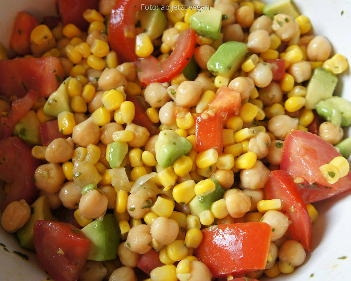 Mais und Kichererbsen mit kalten Wasser gut abspülen und danach gründlich abtropfen lassen.