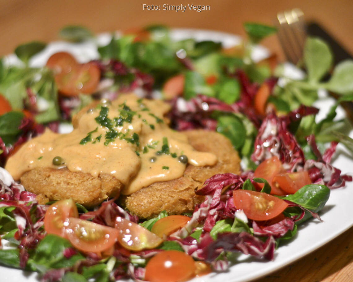 Foto: Simply VeganKichererbsenschnitzel mit Pfefferrahmsauce im Salatbett