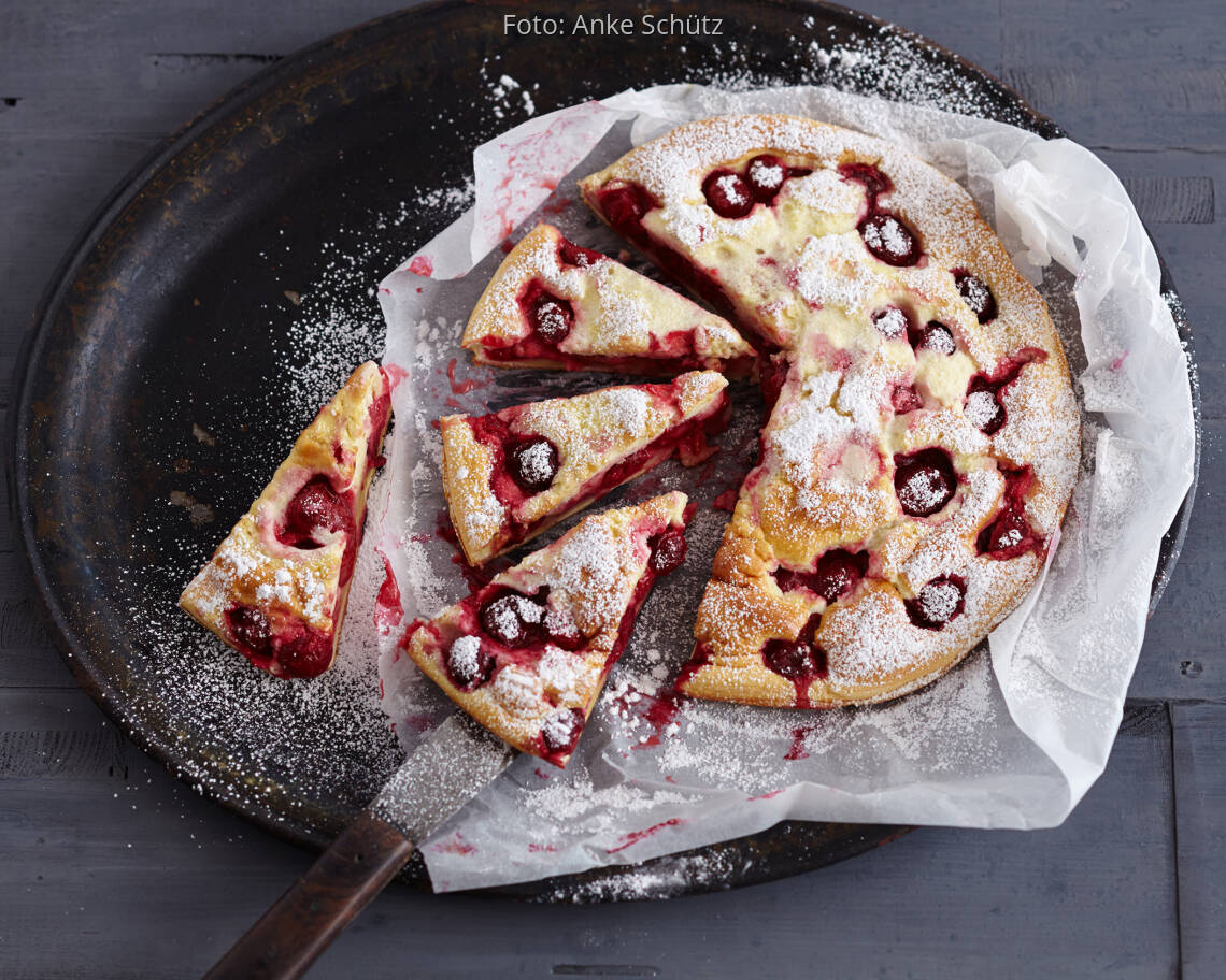 1 kg gewaschene, entsteinte Süßkirschen mit 1 Päckchen Vanillezucker und 1 EL Zucker in einer gefetteten Auflaufform mischen. 4 Eier, 100 g Zucker und 1 Prise Salz verrühren, 300 ml Milch, 100 g Sahne und 150 g Mehl unterrühren. Teig über die Kirschen gießen, im 200° heißen Ofen (Mitte) 30–35 Min. backen. Mit Puderzucker bestäubt servieren.