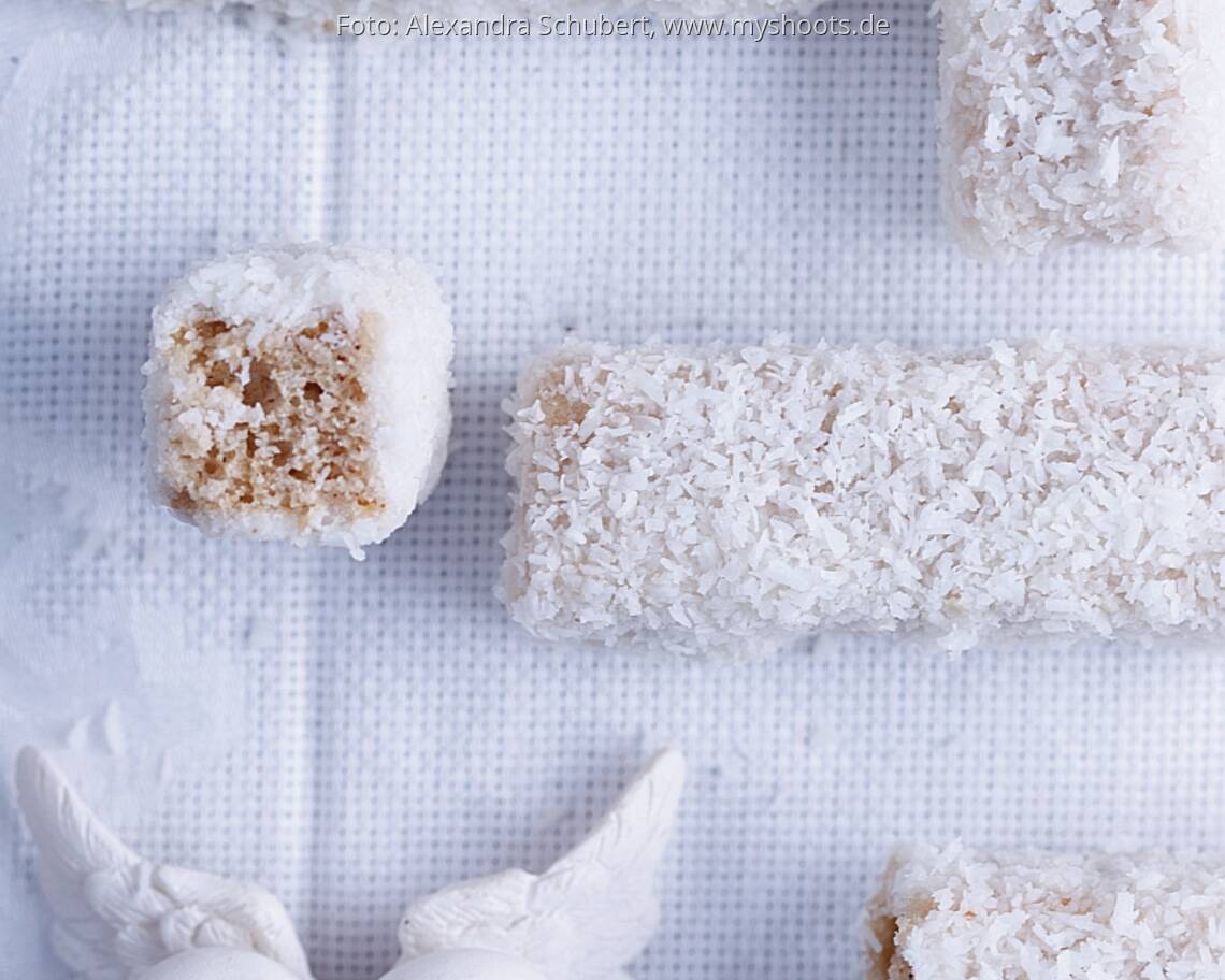 Kokosfett in einem Topf bei mittlerer Hitze schmelzen lassen. Puderzucker darin auflösen. Sojadrink, Vanillezucker und Zitronenschale unterrühren. Den ausgekühlten Teig in ca. 1 cm und 5 cm lange Streifen schneiden. Die Stangen in die Glasur eintauchen und in Kokosraspeln wenden.
