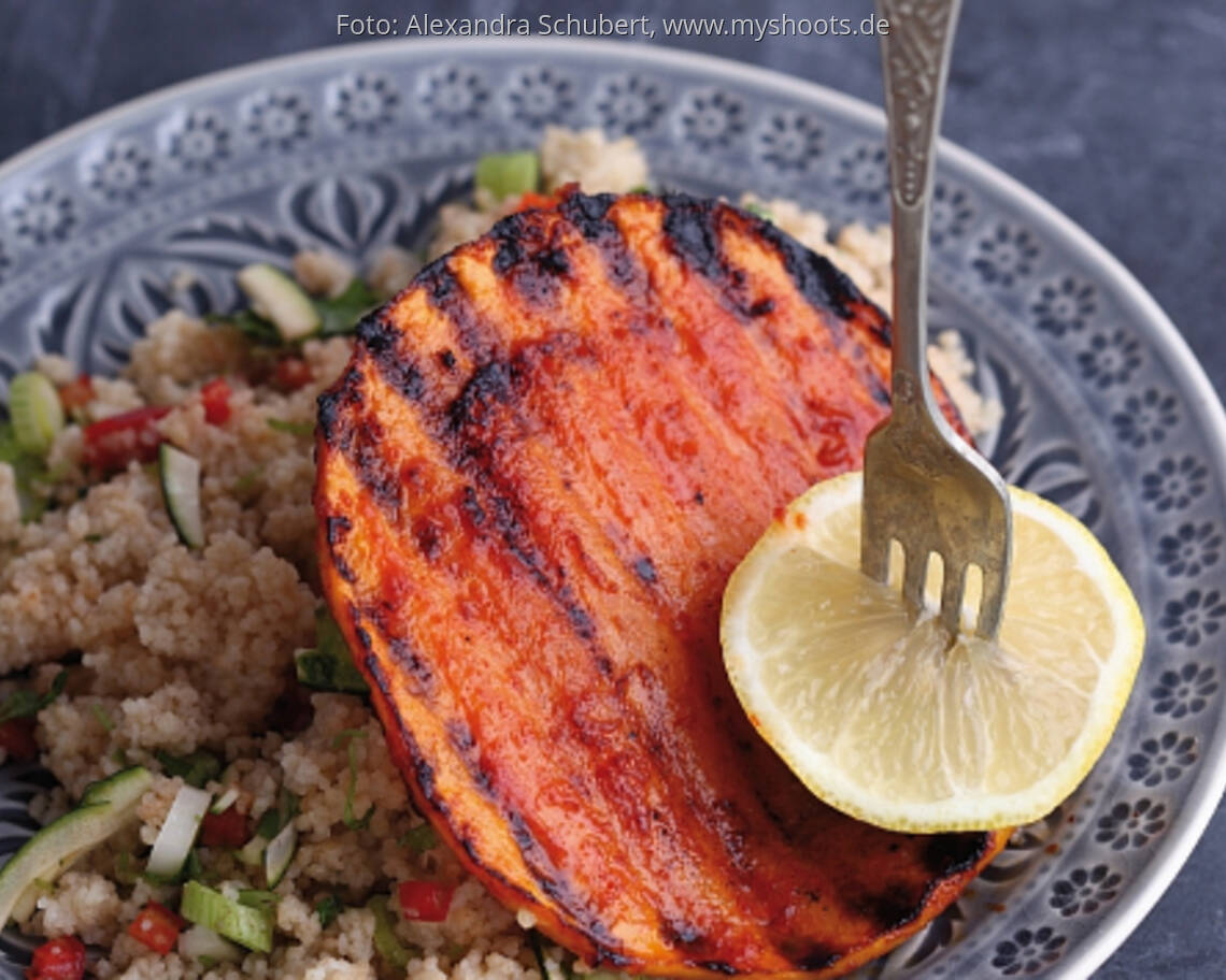 KÜRBIS Kürbis in 1 cm dicke Scheiben schneiden und das Kerngehäuse entfernen. Beim Hokkaido kann die Schale mitgegessen werden, alle anderen Kürbissorten sollten geschält werden. Rapsöl, Zitronensaft, Tomatenmark, Ahornsirup, Chili, Ingwer und Pfeffer verrühren. Kürbisscheiben damit marinieren und ca. 1 Stunde ziehen lassen. Danach gut abtropfen lassen, auf beiden Seiten leicht salzen und bei direkter mittlerer Hitze auf dem Grill auf beiden Seiten 6–8 Minuten grillen.