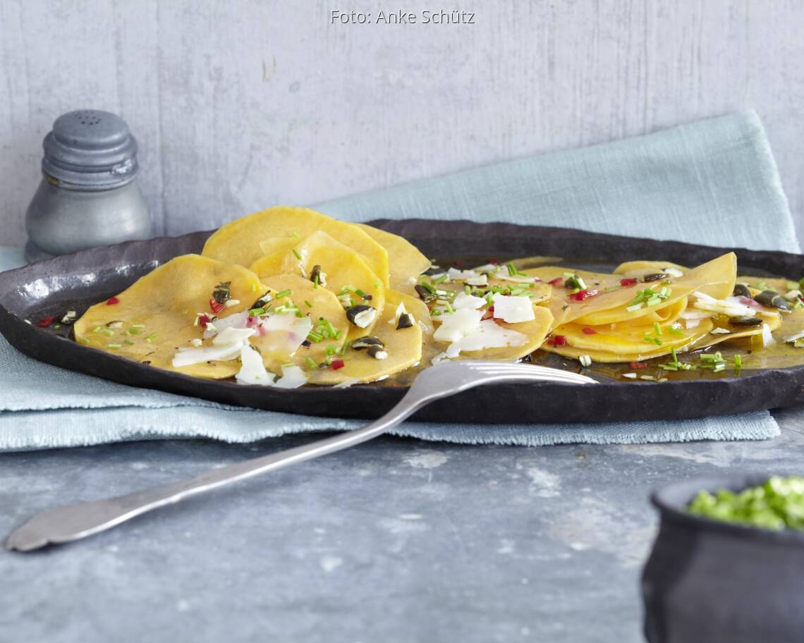 Die Kürbisscheiben trocken tupfen. Vier große Teller mit Olivenöl einstreichen, die Kürbisscheiben leicht überlappend darauf anrichten. Das Carpaccio mit dem Balsamessig beträufeln. Chiliwürfel und Kürbiskerne darüberstreuen, mit Salz und frisch gemahlenem Pfeffer würzen und mit dem Olivenöl beträufeln. Den Käse und den Schnittlauch darüberstreuen. Dazu schmeckt Baguette.