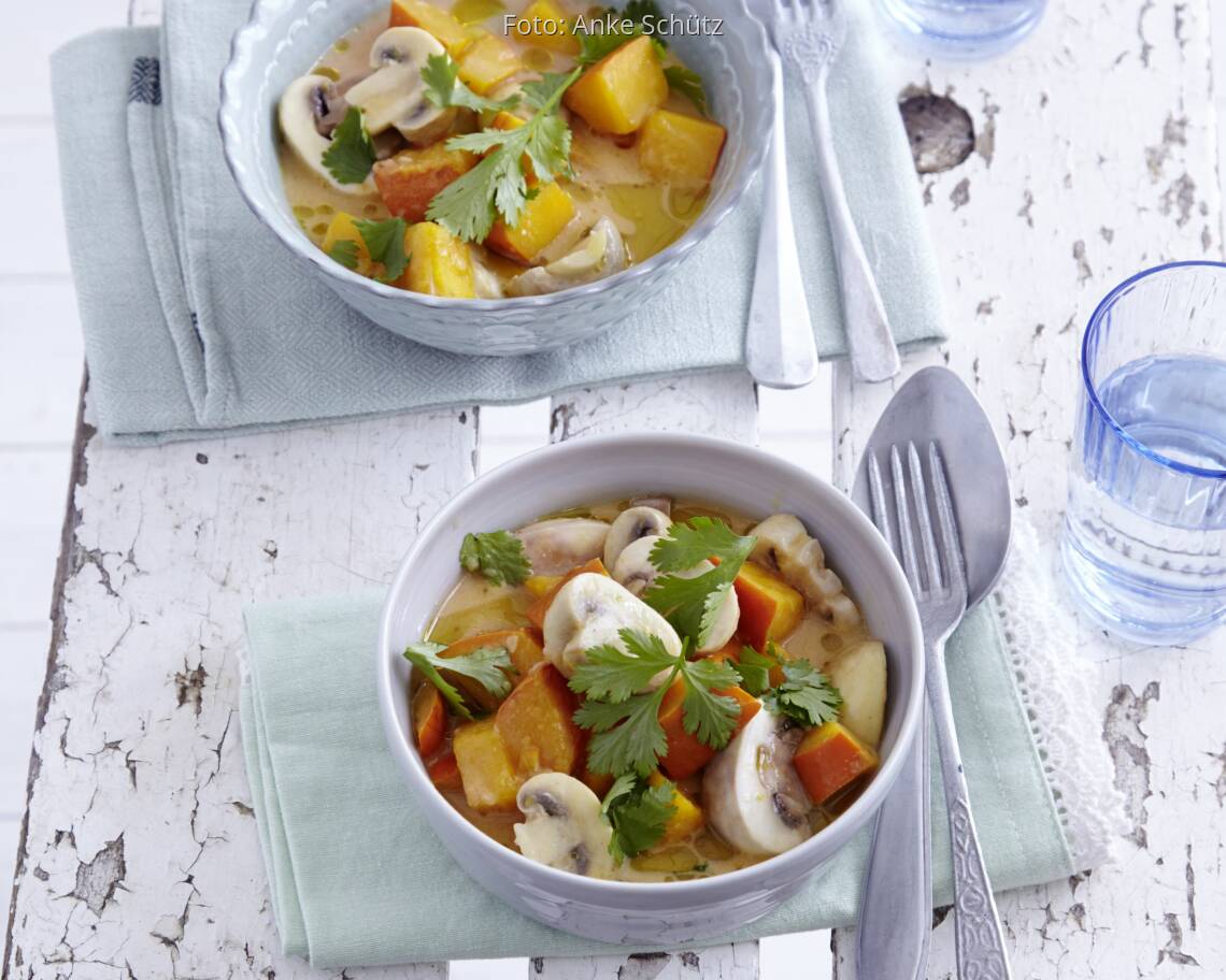 Probieren Sie statt der Kombination aus Kürbis und Pilzen folgende Varianten: Blumenkohl bzw. Brokkoli mit Tomaten, Rosenkohl mit Knollensellerie oder Zucchini mit Paprikaschoten. Das Gemüse je nach Sorte putzen und waschen oder schälen, und das Curry damit wie im Rezept oben beschrieben zubereiten.