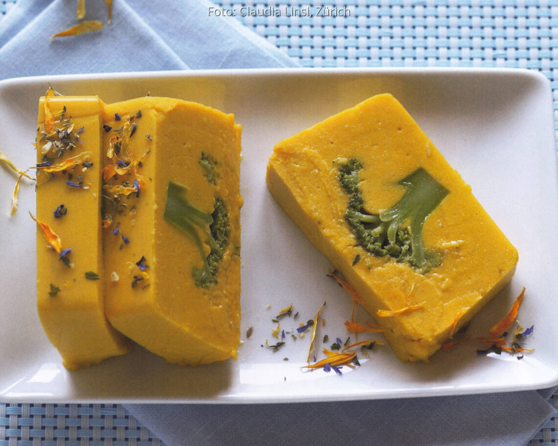 Die gekochten Kürbis- und Kartoffelwürfel im Mixer pürieren, den Rahm und die Gewürze daruntermischen. Den Agar-Agar zum erkalteten Kochsud geben und unter ständigem Rühren etwa 4 Minuten kochen lassen, dann sofort unter das Kürbis-Kartoffel-Püree mischen. Die Hälfte der Masse in die mit Klarsichtfolie ausgelegte Terrinenform füllen. Die Brokkoliröschen in einer Reihe sorgfältig kopfüber in die Mitte der Terrine stellen und mit der restlichen Masse bedecken. Die Terrine mit einem Gummischaber glattstreichen und mindestens 6 Stunden im Kühlschrank fest werden lassen.