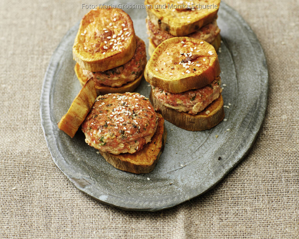 Zum Servieren die Lachsbuletten jeweils zwischen 2 Süßkartoffel-scheiben auf Tellern anrichten (übrige Süßkartoffeln extra dazu servieren). Mit dem Sesam bestreuen.
