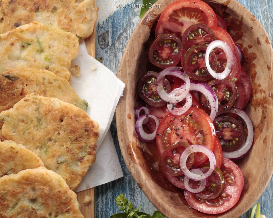 Foto: Günter BeerLauch-Bohnen-Puffer mit Tomatensalat
