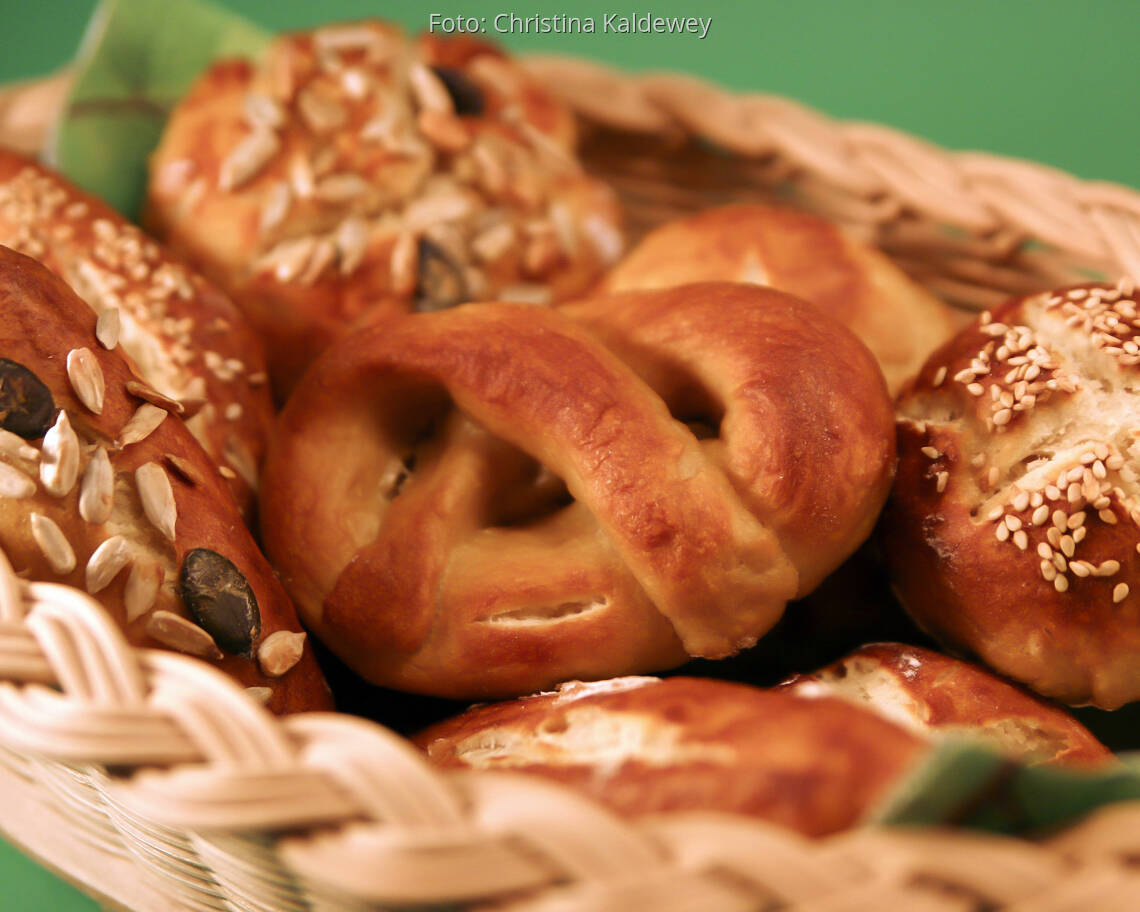 Teig nochmals durchkneten und Brötchen, Brezeln und Stangen formen.