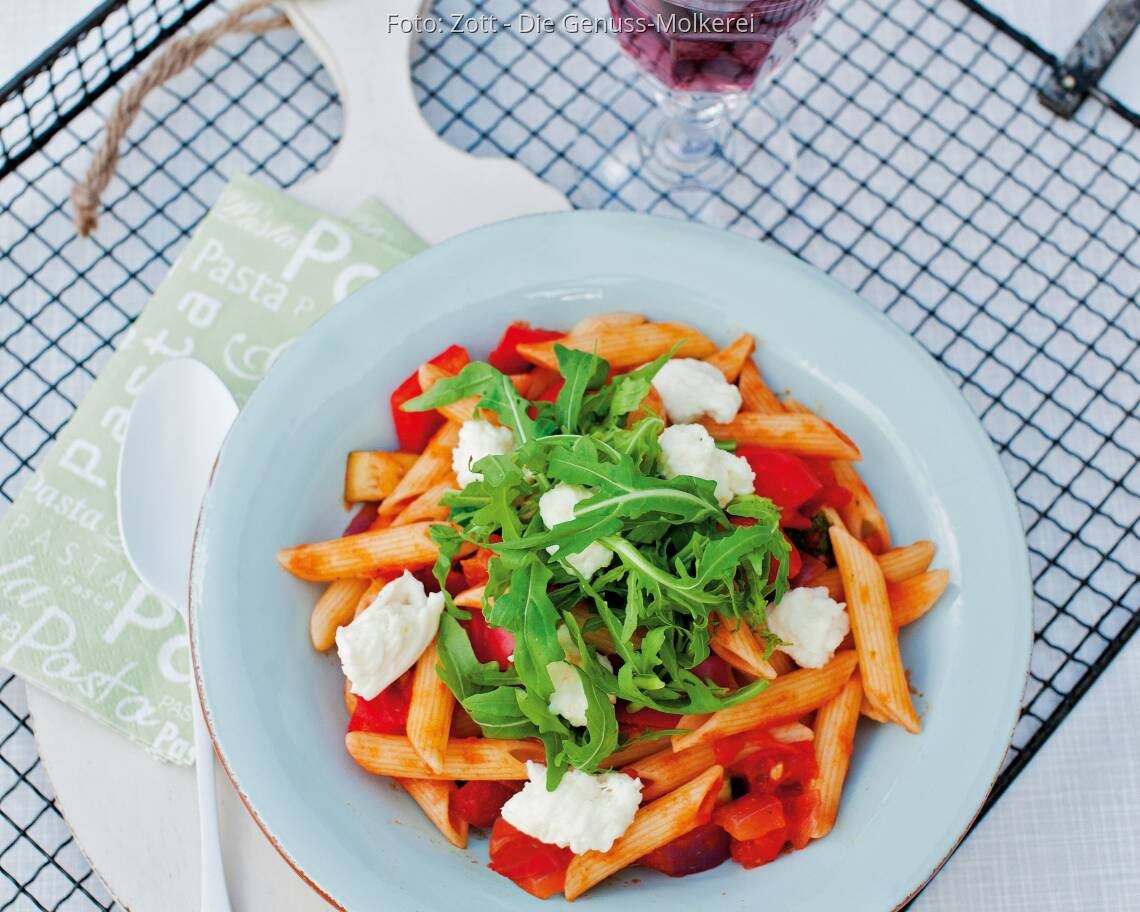 Penne nach Packungsanweisung in reichlich Salzwasser bissfest kochen. Zottarella Kugel abtropfen lassen und in Stücke reißen. Nudeln abgießen und abtropfen lassen. Mit den Tomaten mischen, nochmals abschmecken und auf Teller verteilen. Mit Zottarellastücken bestreuen und mit Rucola anrichten.