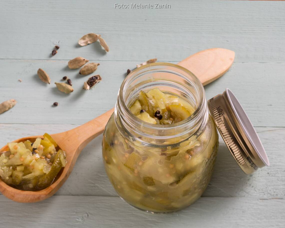 Das Chutney heiß in ein sauberes Twist-off-Glas füllen, verschließen und bis zur Verwendung mindestens 1 Woche durchziehen lassen. Es schmeckt besonders zu indischen Lammgerichten, Rindfleisch und Gegrilltem.