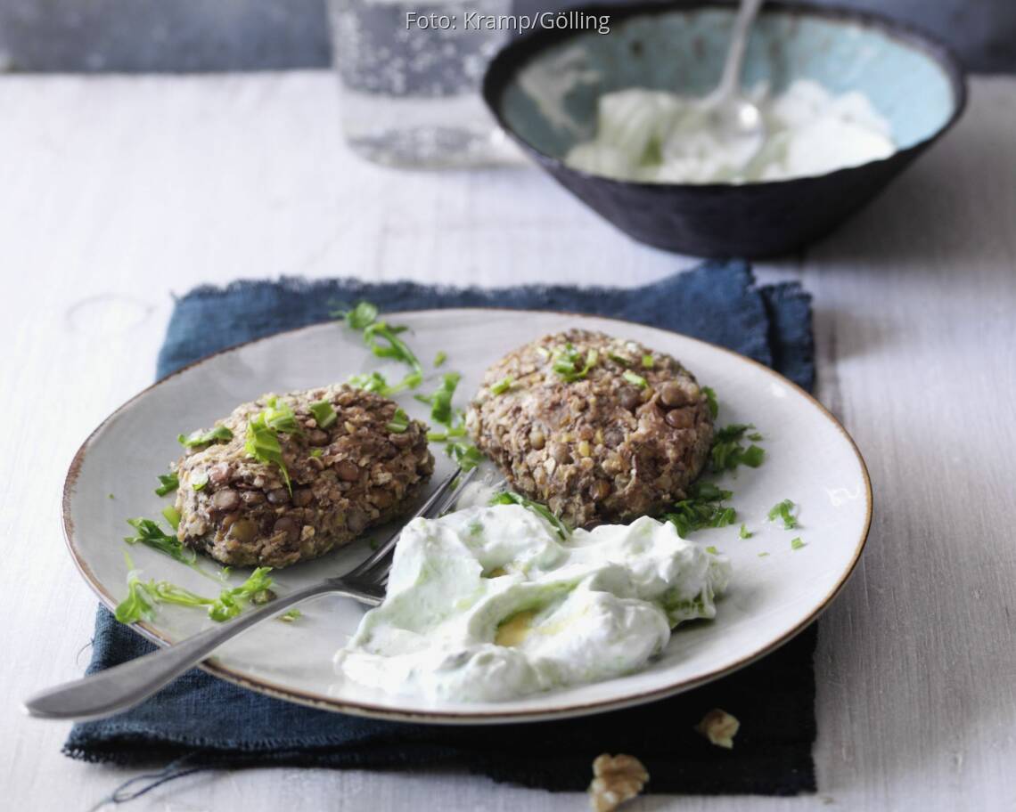 Foto: Kramp/GöllingLinsen-Nuss-Laibchen mit Avocado-Joghurt-Dip