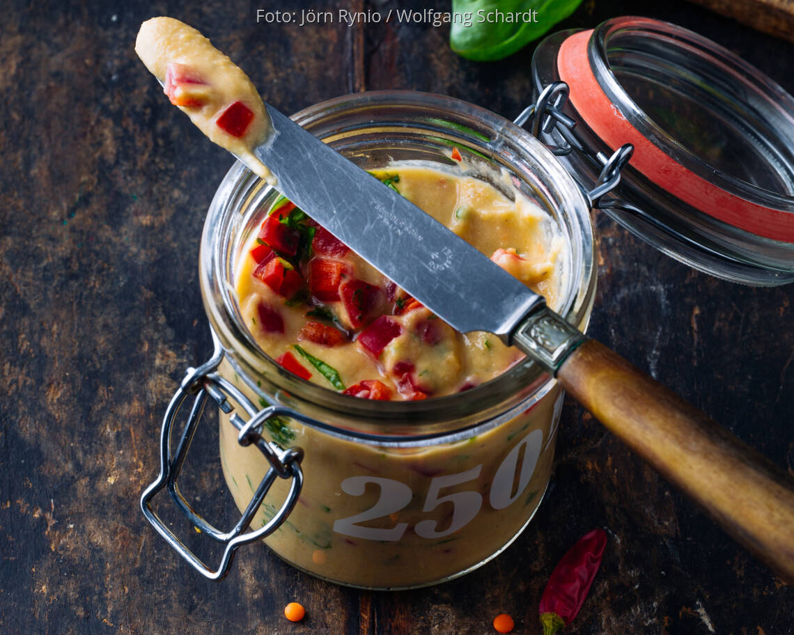 Die Zwiebel aus den Linsen entfernen und diese auskühlen lassen. Erkaltete Linsen mit dem Öl und dem Joghurt in einen hohen Rührbecher geben und mit dem Stabmixer pürieren. Paprika, Basilikum und Chili untermischen und die Creme mit Zitronensaft, Honig und Salz abschmecken. Die Linsencreme schmeckt als Dip zu Gemüsesticks oder als Aufstrich auf Toast oder Brot.
