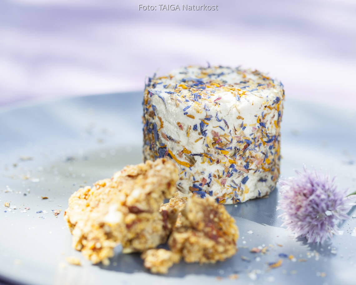 Nach 2 Tagen wird die dick gewordene Creme aus dem Tuch geholt, mit Hefeflocken vermischt und in mehrere Dessertringe gepresst. Im Kühlschrank wird der Käse fest; dann beliebig in Paprikapulver, geschrotetem Pfeffer oder Blüten wälzen.