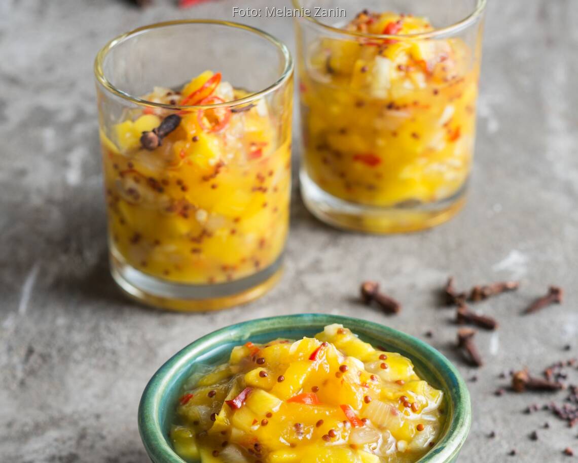 Die Limettenschale unterrühren. Das Chutney mit Salz und nach Belieben mit Pfeffer abschmecken. Heiß in ein sauberes Twist-off-Glas füllen, verschließen und abkühlen lassen. Mangochutney wird in Indien klassischerweise zu Reisgerichten oder Papadams – dünnen frittierten Fladen aus Linsenmehl – gereicht.