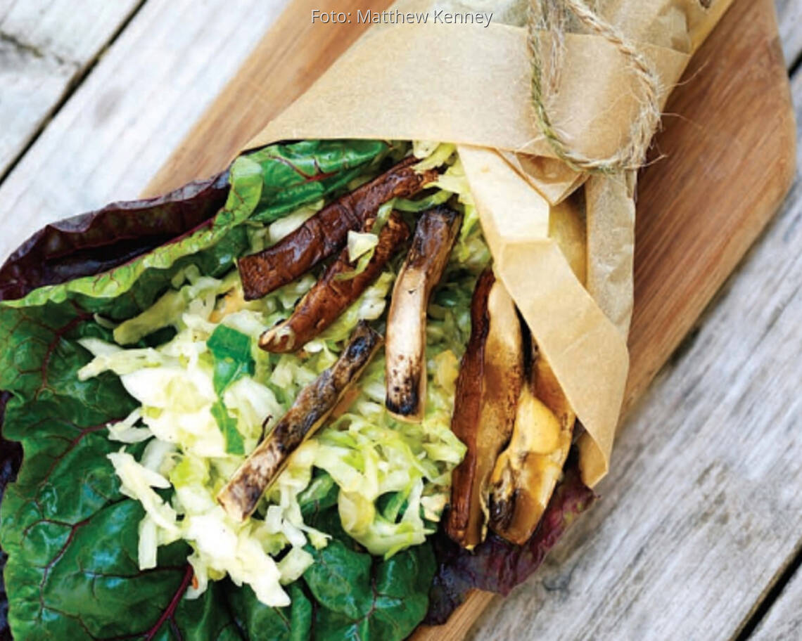 ANRICHTEN Auf jedes Mangoldblatt eine großzügige Portion Sauerkraut und einige marinierte Pilzscheiben geben. Vor dem Aufrollen mit etwas Dressing beträufeln oder an den Rand geben.