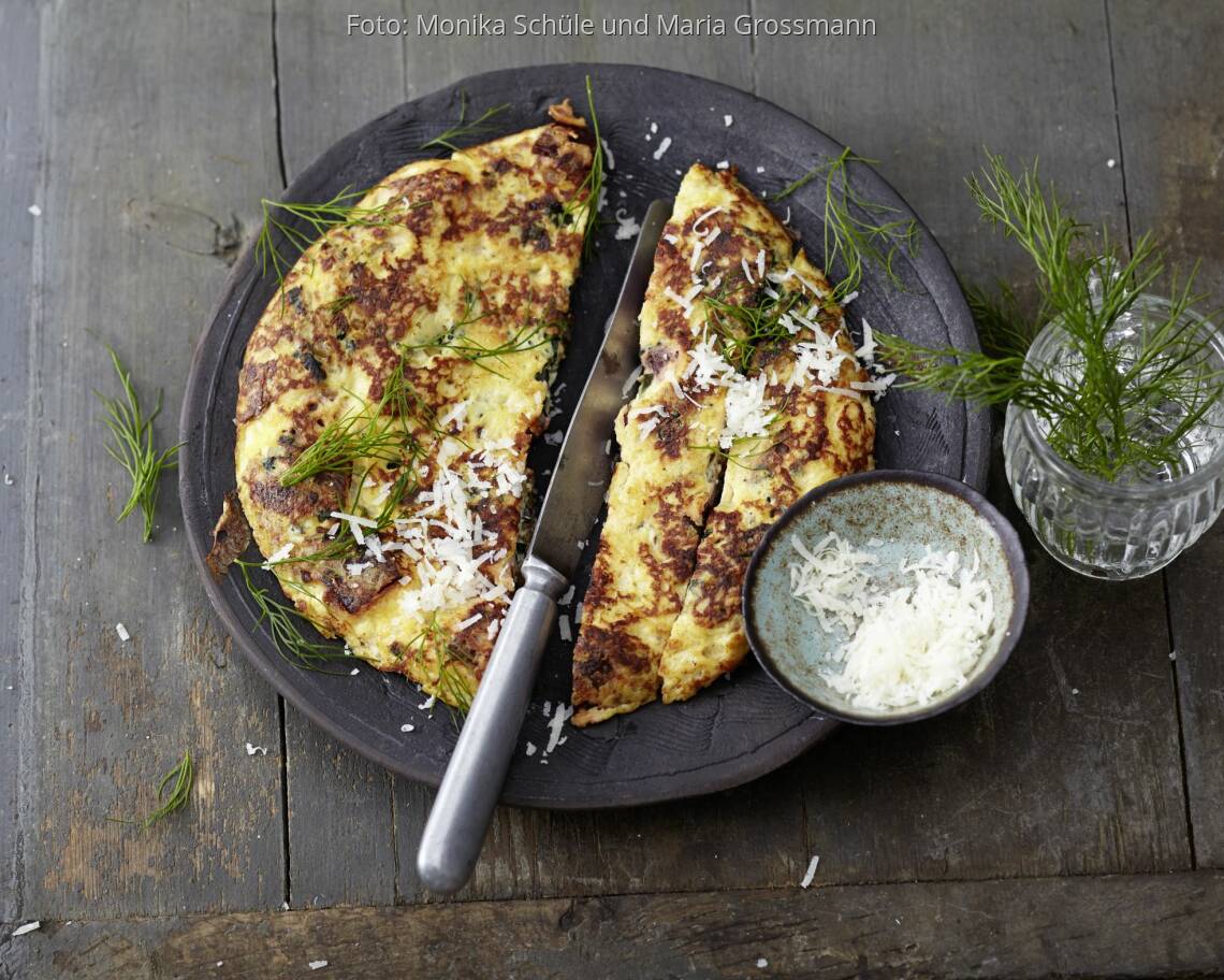 Wenn die Frittata unten goldbraun und oben fast gestockt ist, die Pfanne in den heißen Ofen (Mitte) schieben und die Frittata in 3–5 Min. fertig backen. Auf einen Teller gleiten lassen, mit Käse und Dill bestreuen. Auf Teller verteilen und ofenheiß oder lauwarm servieren.