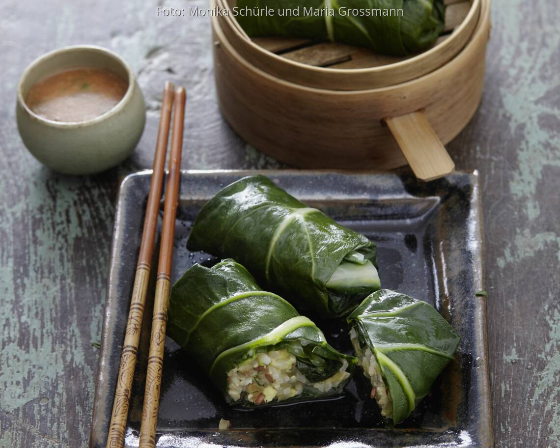 veganes Rezept von Susanna BingemerDie zarten Mangoldblätter werden mit einer herzhaften Füllung aus Reis und Tempeh zubereitet und dann sanft im Dämpfkorb gegart.
