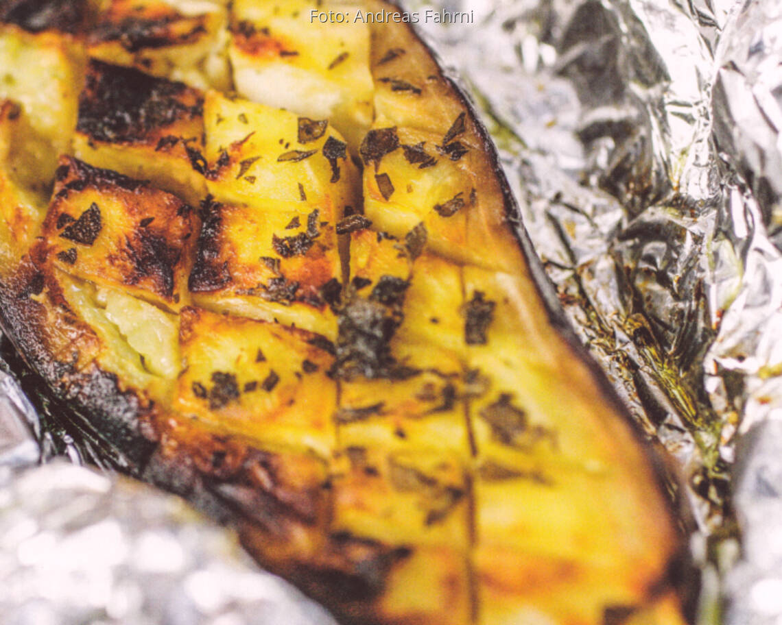 Die Auberginen in der Folie mit den Schnittflächen nach unten auf den heißen Rost legen und etwa 15 Minuten backen. Dann auswickeln und mit der Schnittfläche nach oben weitere 15 Minuten nicht zu heiß fertig braten; die Früchte sollen durch und durch weich sein.