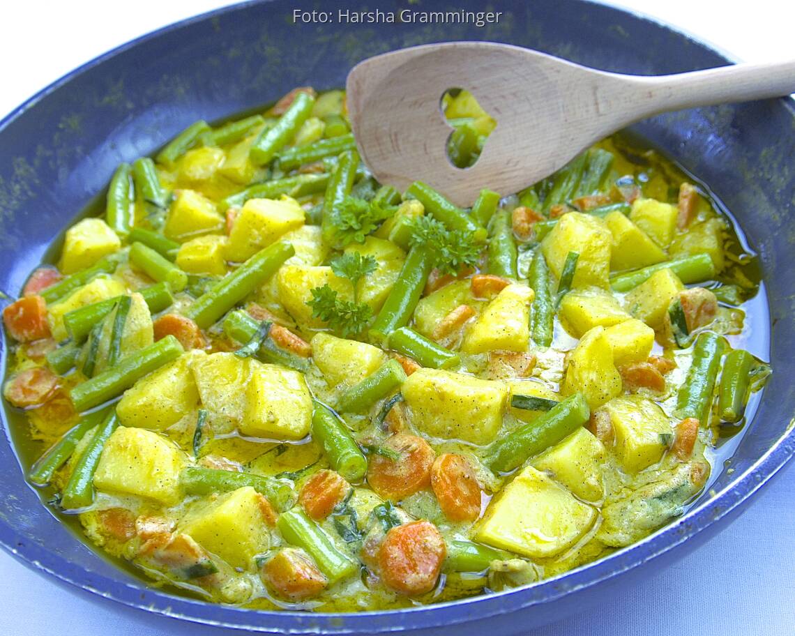 vegetarisches Rezept von Harsha GrammingerMildes Karotten-Bohnen-Curry wirkt Vata neutral – Pitta neutral – Kapha neutral