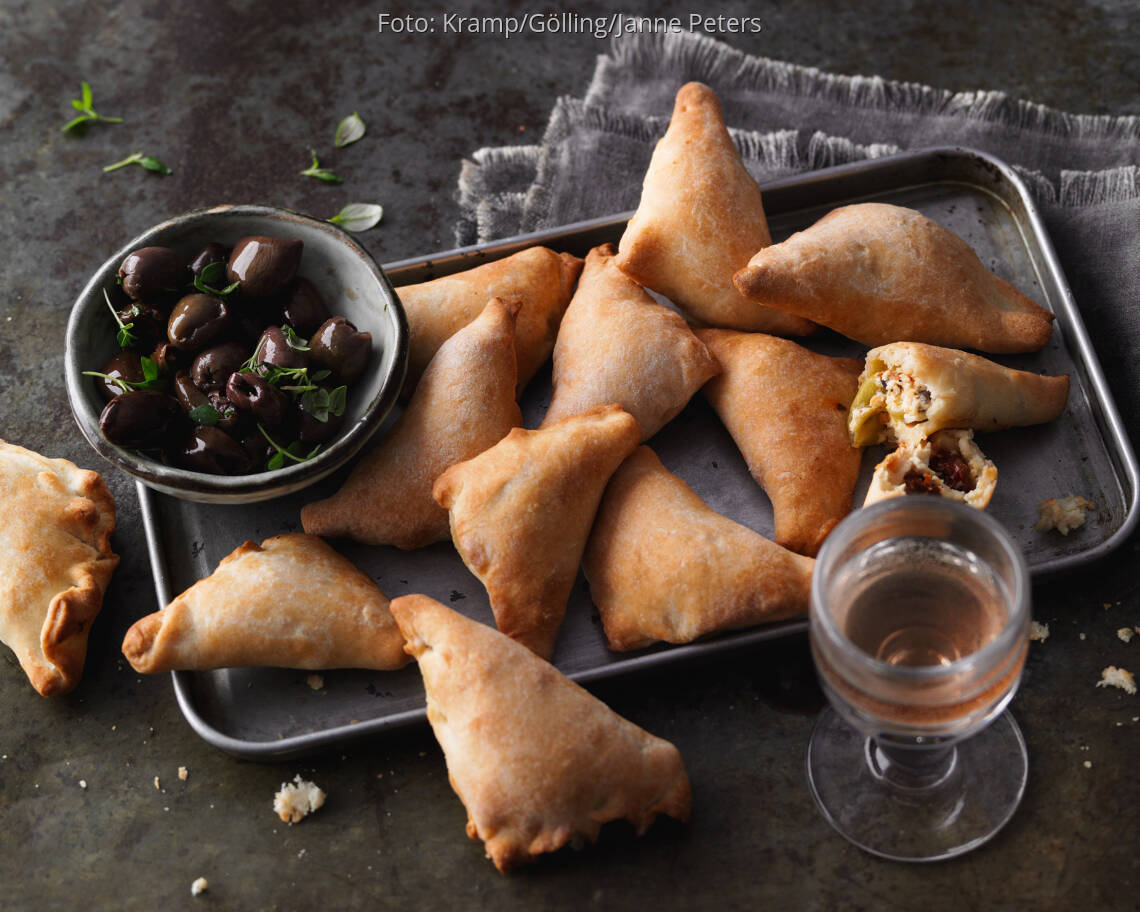 Den Teig entrollen und in acht Stücke à 5 × 9 cm schneiden. Die Teigstücke jeweils mit den Händen etwas breiter ziehen. Auf eine Hälfte je 1 gut gehäuften EL Füllung geben. Die andere Teighälfte diagonal darüberschlagen. Die Rändern mit den Händen zusammendrücken und mit den Fingern zu einem gut verschlossenen Rand formen.