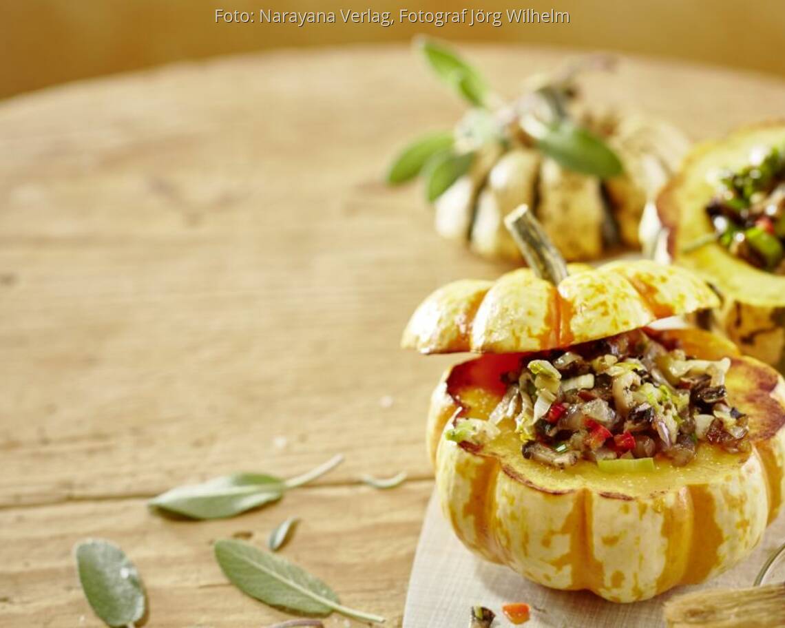 Foto: Narayana Verlag, Fotograf Jörg WilhelmMit Pilzen und Salbei gefüllter Eichelkürbis aus dem Backofen