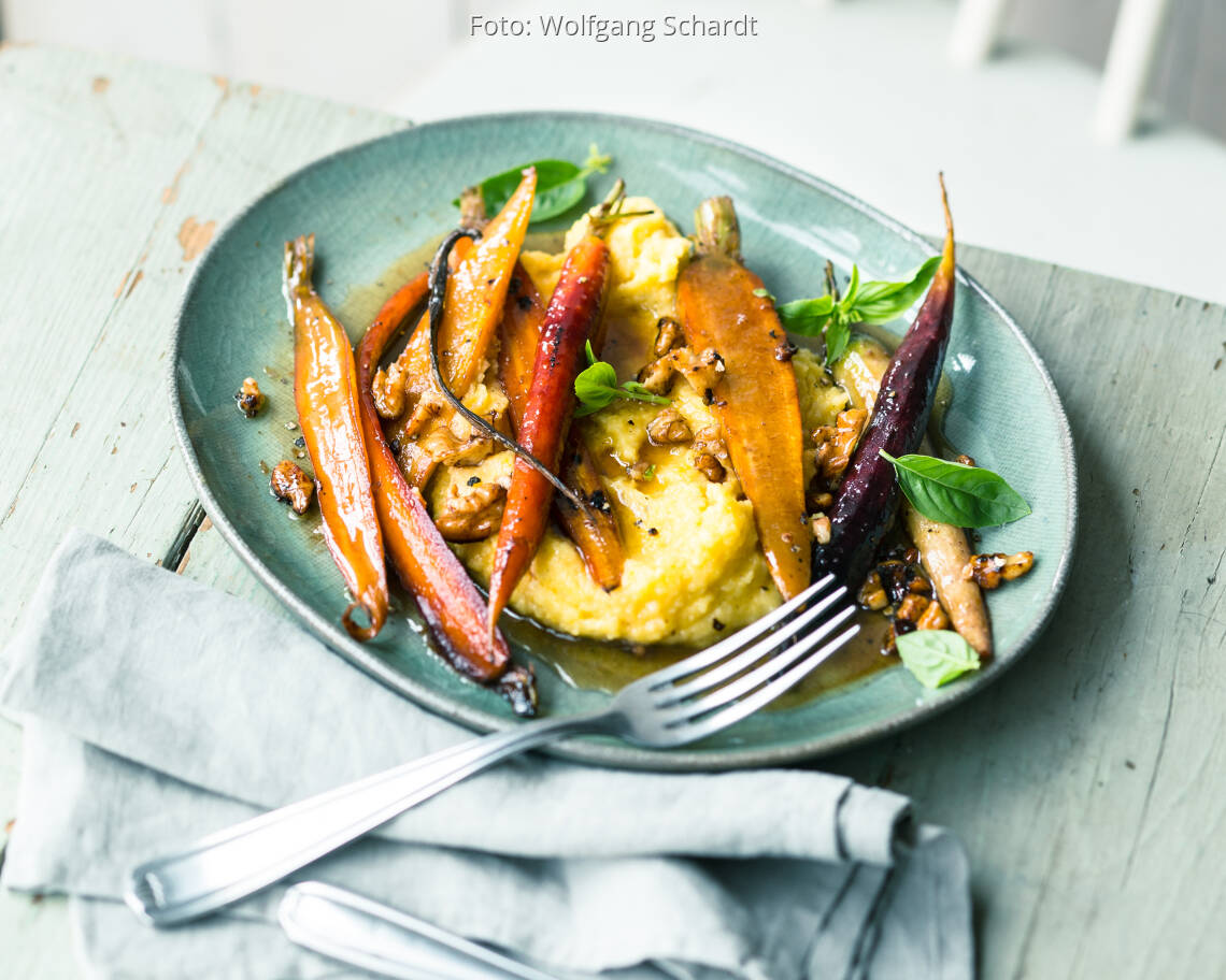 Foto: Wolfgang SchardtMöhren mit Walnuss-Butter, Vanillepolenta und Basilikum