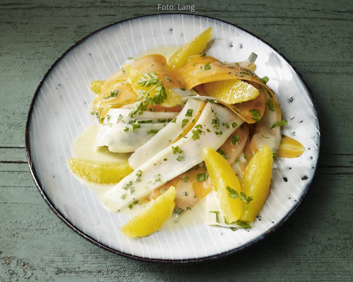 Die Gemüsestreifen wie eine Pasta anrichten und die Orangenfilets drüberdrapieren. Alles mit dem Dressing begießen und den Salat servieren.