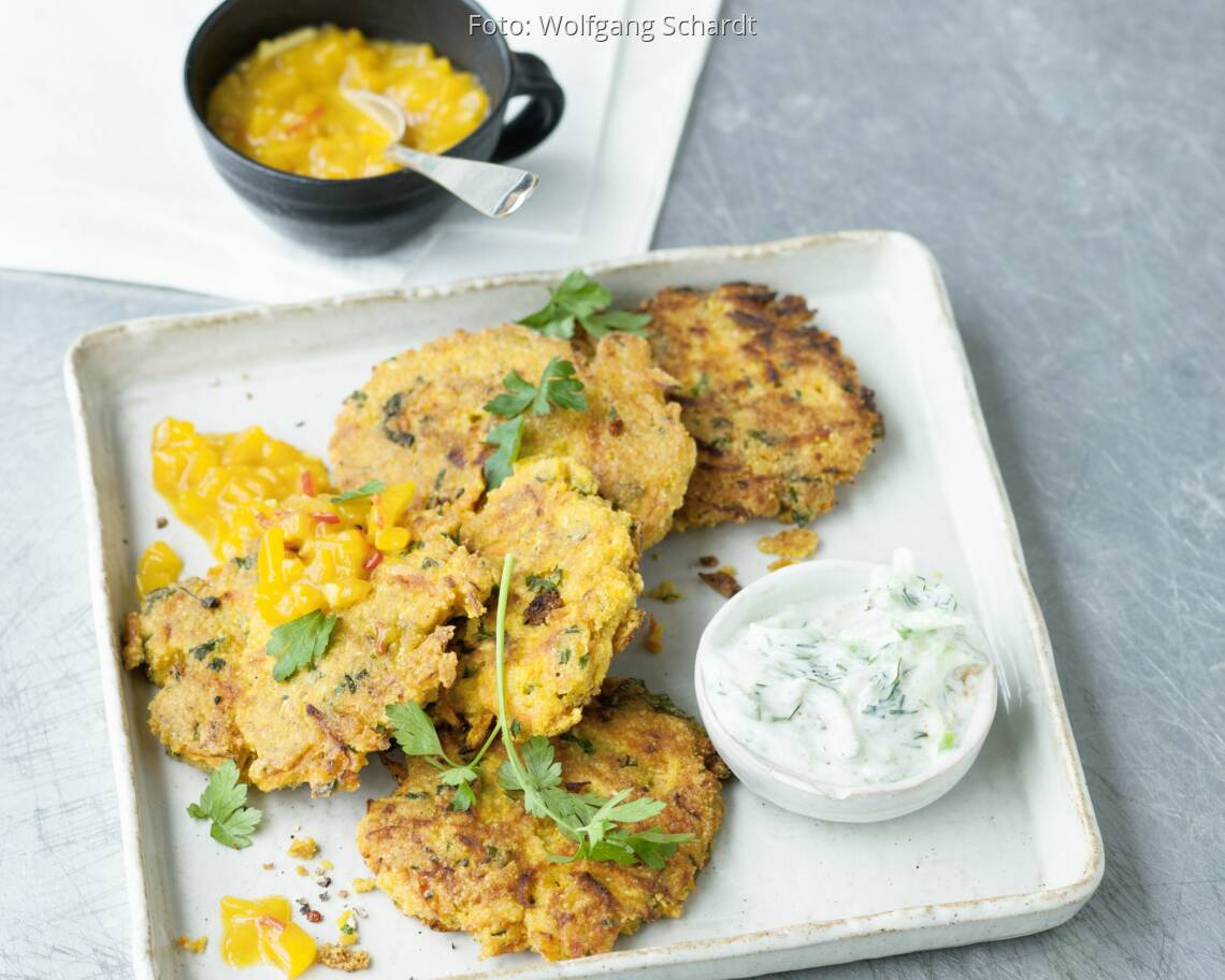 vegetarisches Rezept von Marianne ZunnerGegensätze ziehen sich an, auch auf dem Teller: knusprige Gemüseküchlein, chilifeurige Mangosauce und als Kontrast dazu ein erfrischender Dilljoghurt.